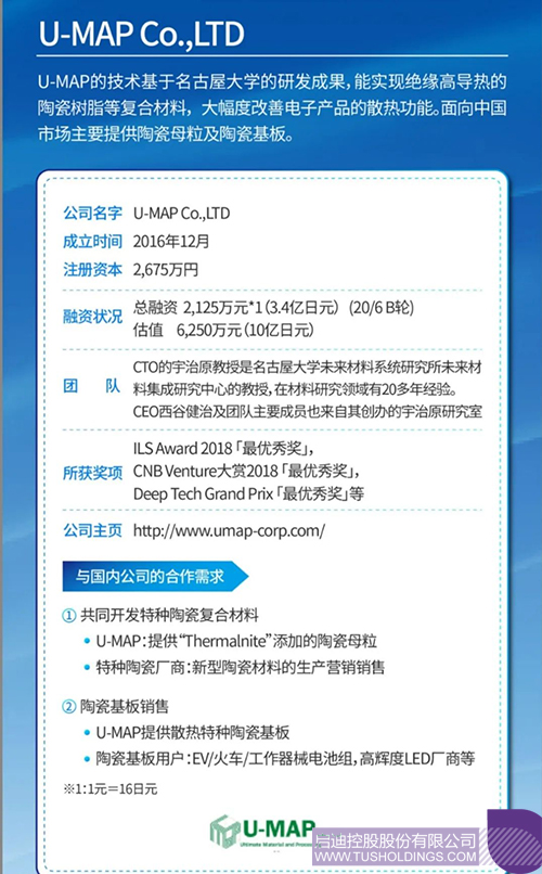 U-MAPÔòÊÇ»ùÓÚ±¾¹«Ë¾µÄÏËά״µª»¯ÂÁµ¥¾§Ìí¼Ó¼Á¡°Thermalnite¡±£¬Ìṩ¾ßÓоøÔµ¡¢¸ßµ¼ÈÈÐÔÄܵÄÌÕ´ÉĸÁ£ºÍ»ù°å¡£Í¬Ê±U-MAPÒ²ºÜÊÇÏ£ÍûÄÜÓëÖйú¹«Ë¾Ò»µÀ¿ª·¢ÌØÖÖÌմɸ´ºÏÖÊÁÏ¡£